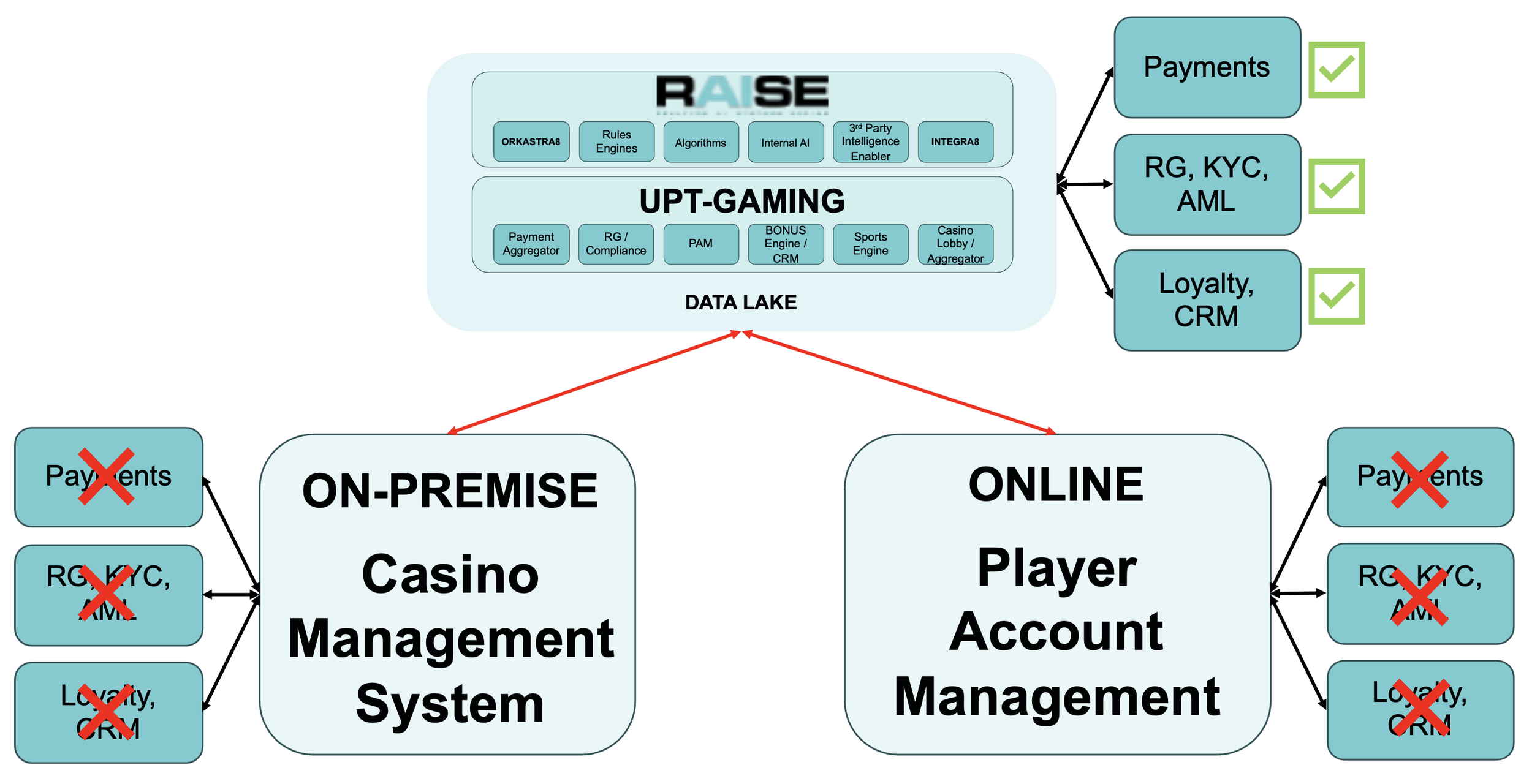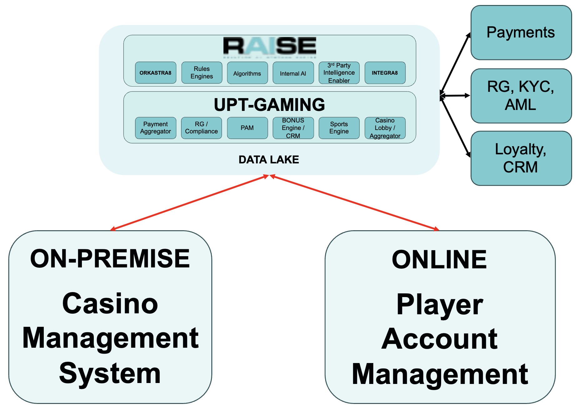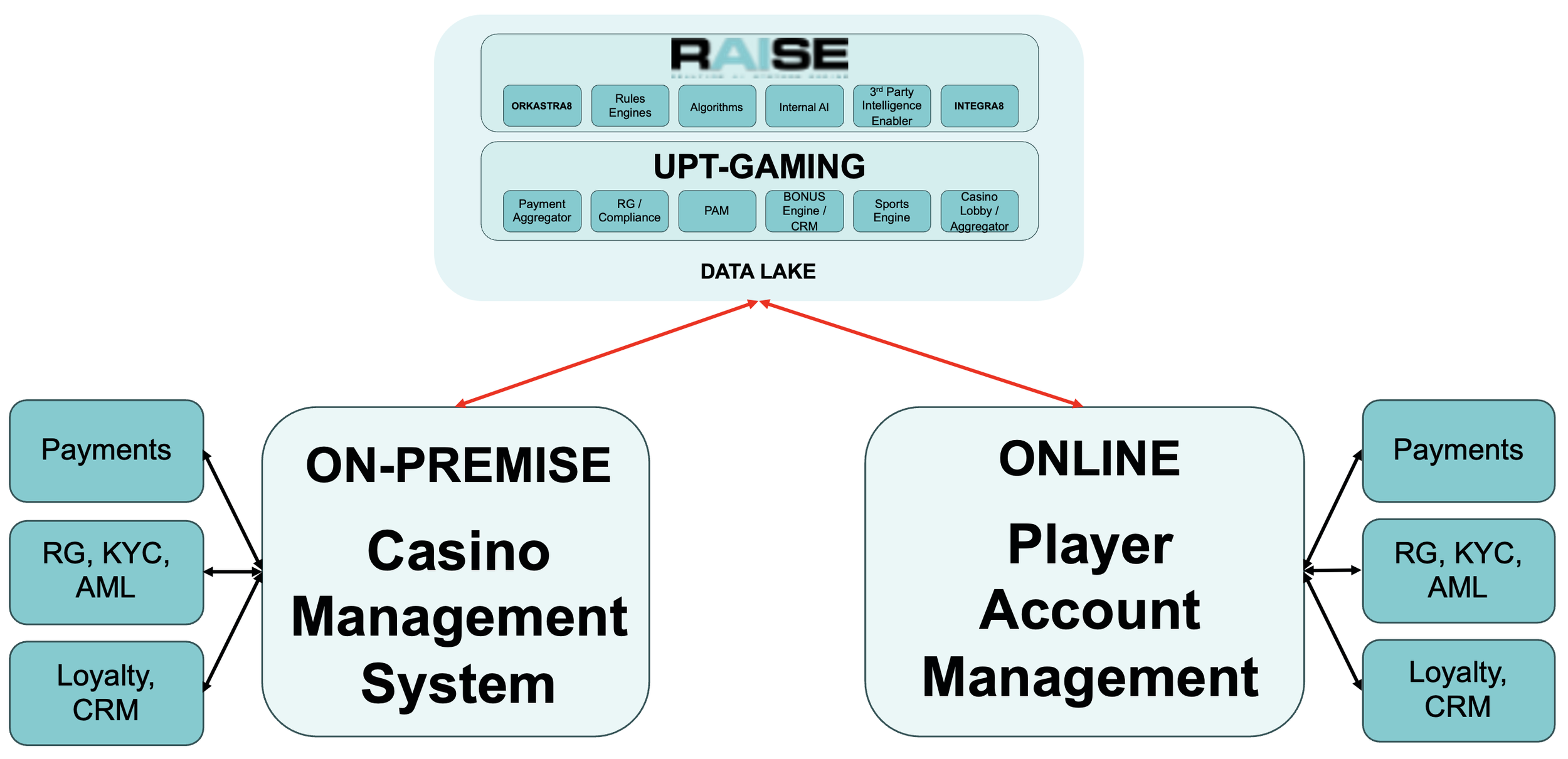 We provide an industry agnostic middleware layer that sits on top of your systems (RAISE), integrating to your on-premise and online PAM’s, plus whatever other systems required. Critically, this is supported by our extensive library of integrations (payments, KYC, AML, Sports, Casino etc) and our Gaming services to establish a core solution which can achieve the typical short-term objectives of coordinated registration, and simple marketing. Yet it also via its ‘Persona’ functionality creates a single-view of the customer and establishes a master account - linked to accounts in all other systems.