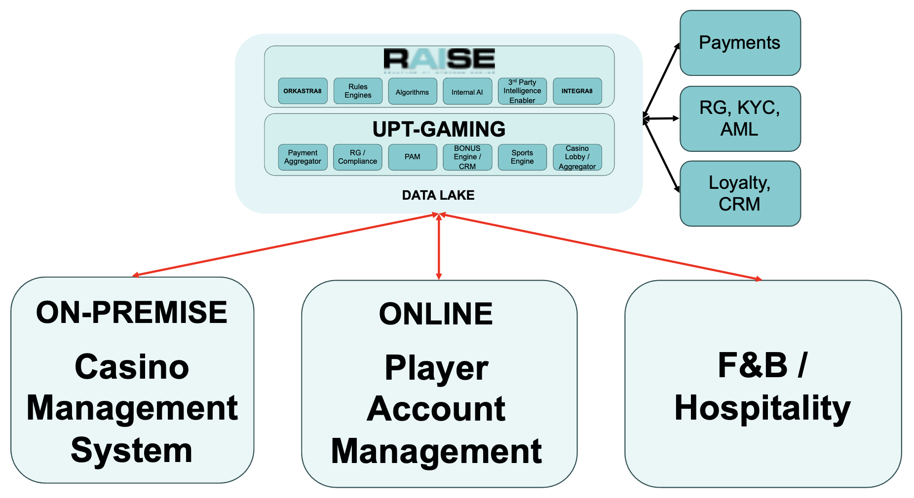 INTEGRA8 - which deals with integration with all touch points. We have decades of experience in implementing gaming integrations in retail and online systems. Integration effort is reduced for target systems as we understand how they work in terms of payments, CRM, KYC, AML, etc - and we can leverage those integration types to provide hooks and triggers into systems without creating everything from scratch.
