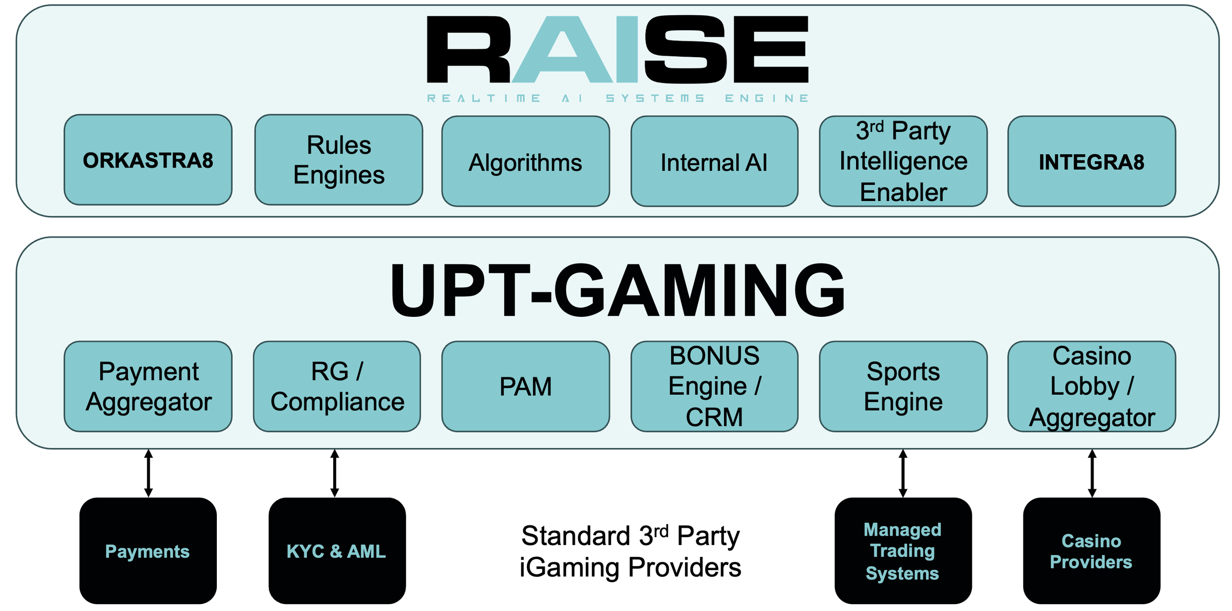 RAISE, which is essentially middleware for gaming (albeit industry agnostic), can satisfy an unlimited set of use cases in real-time for both internal and external facing functions. It is constructed of 2 distinct elements -